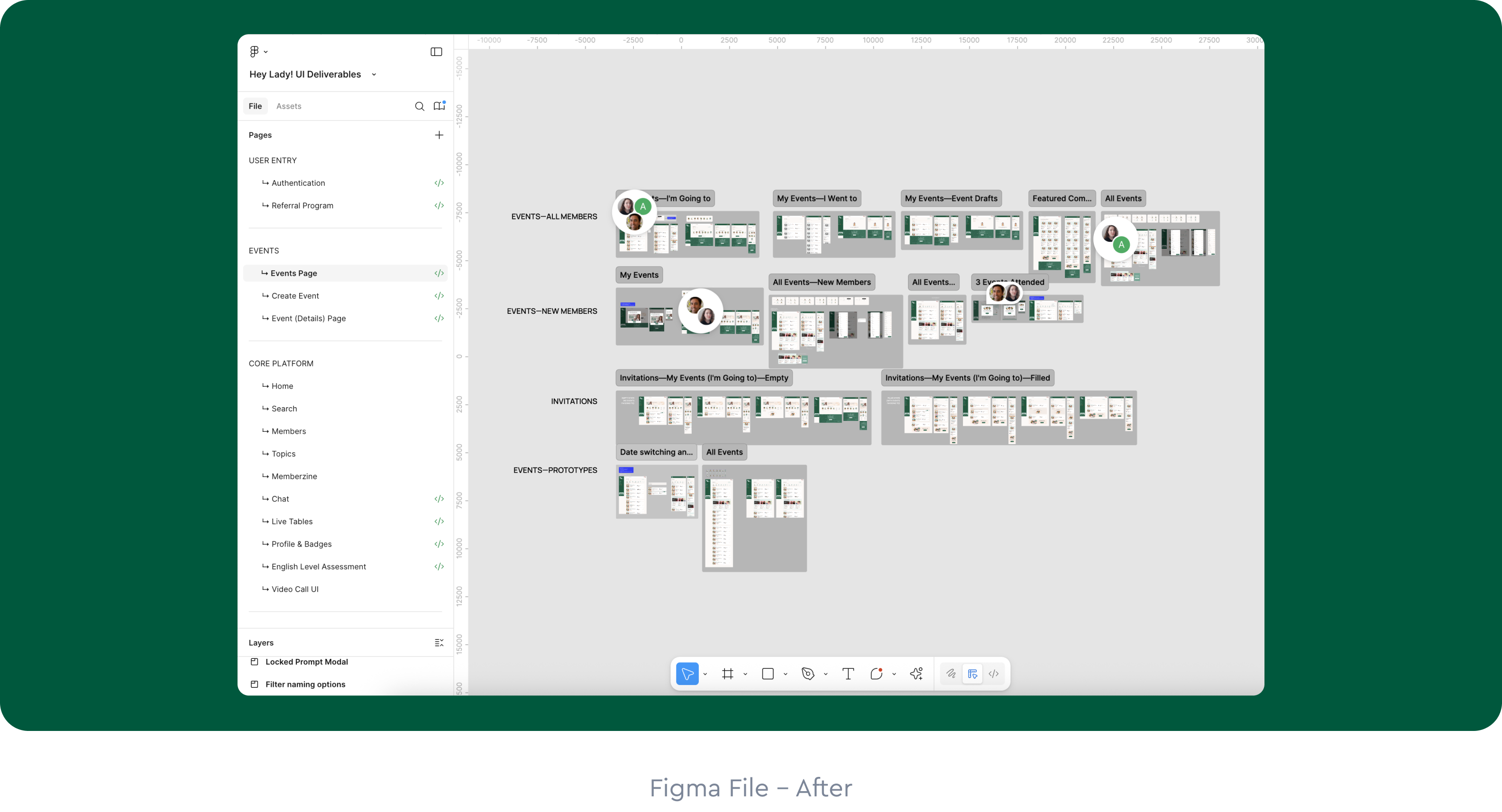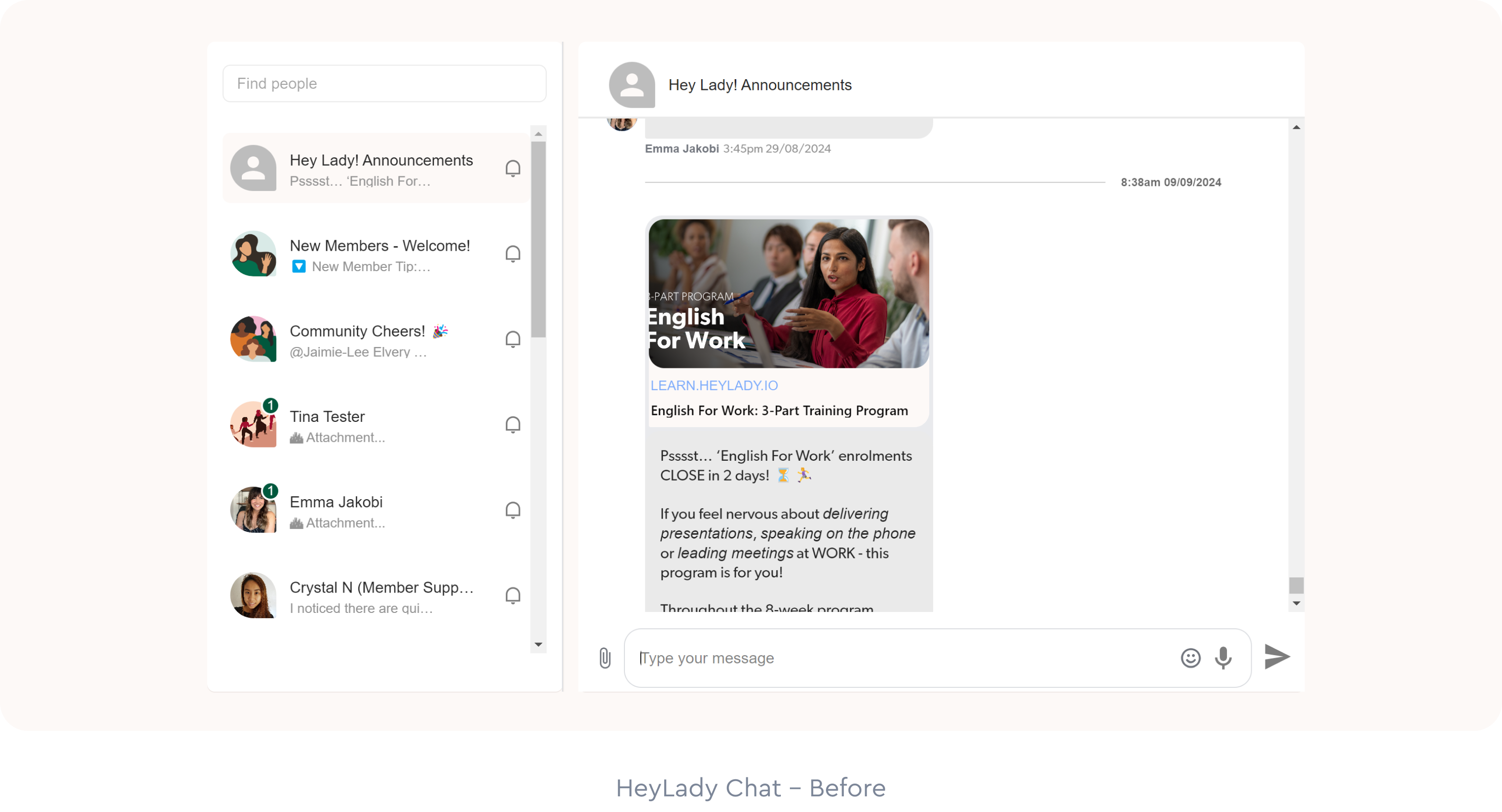 We began interviewing the founders and team, then Community Success and coaches, to find out pain points in chat groups, channels, and event discovery. Our team also ran targeted member interviews and shaped Jobs-to-be-Done around three goals: find someone to talk to now, prepare for a work opportunity, and build confidence. We then used the insights to design and simplify member and admin flows and prioritize the team’s effort.