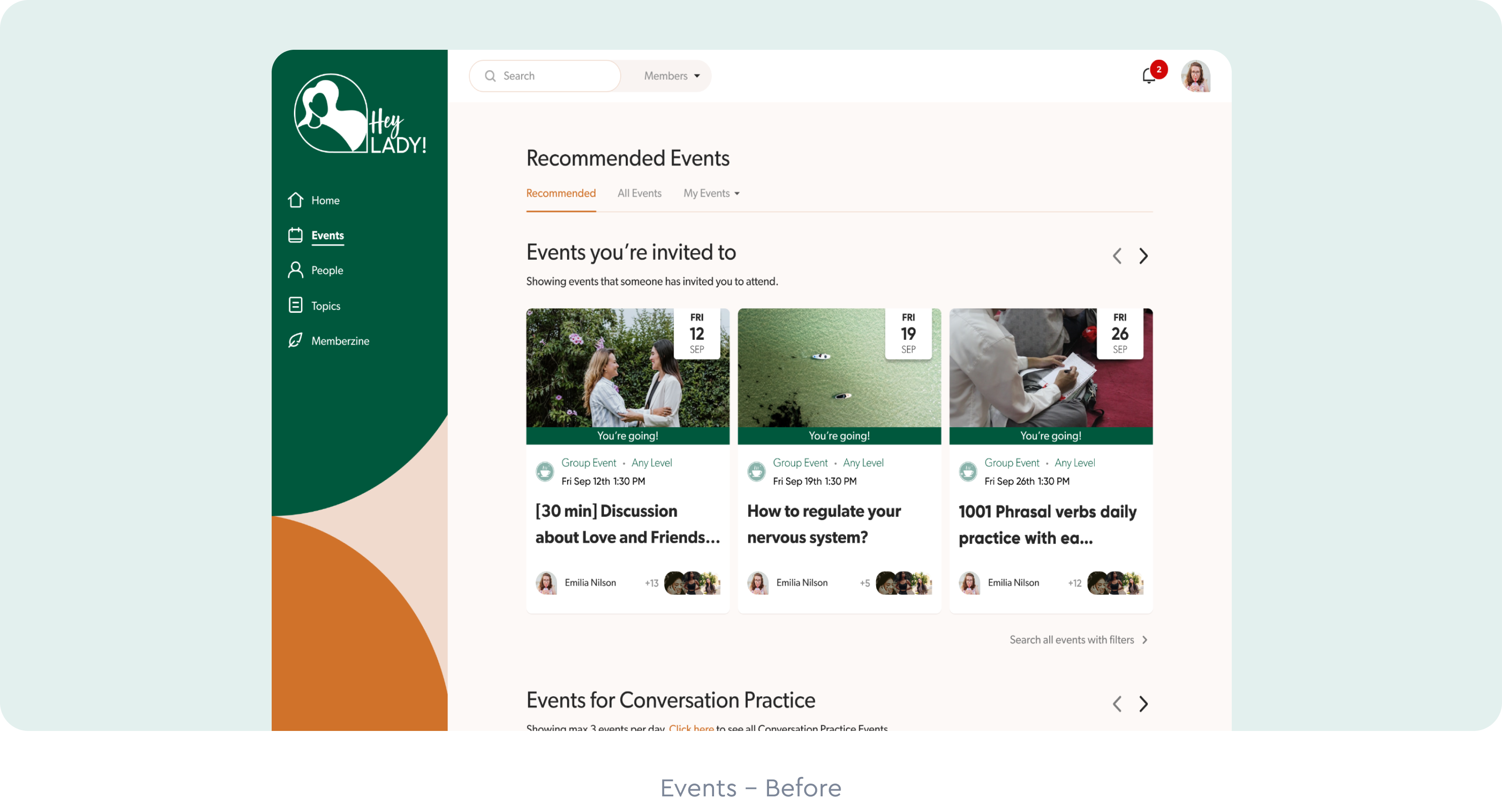 HeyLady asked us to help redesign onboarding around first value. We replaced long tours with a product-led flow that moves newcomers into a real conversation much faster. The flow guides each member to either a scheduled Event or a Live Coffee Table, depending on availability and comfort. We measured success by how quickly a newcomer finds and joins their first conversation and how confident they feel afterward.